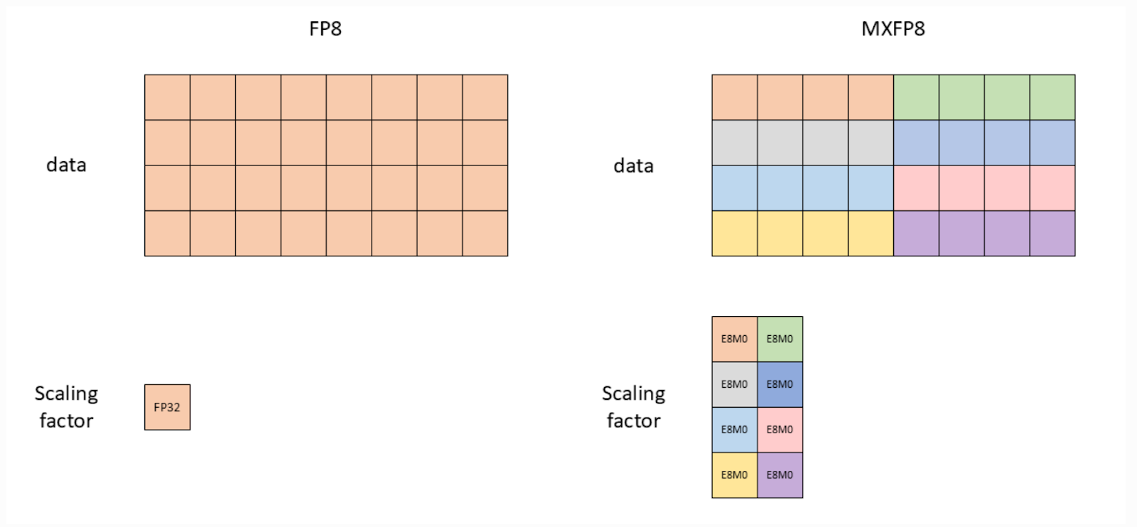 圖 1:Float8 張量級(左)與 MXFP8(右)的視覺比較(圖片來源:NVIDIA 文件)