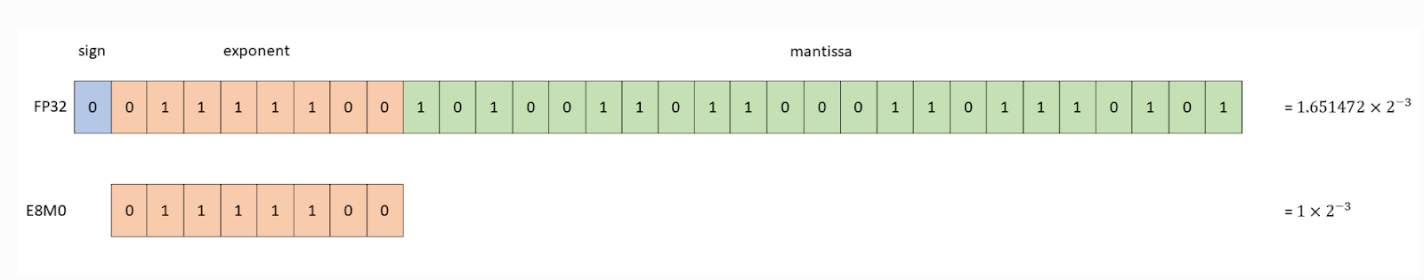 另一個變化是縮放因子精度從 FP32 變為 E8M0(實際上是 2 的冪次縮放)