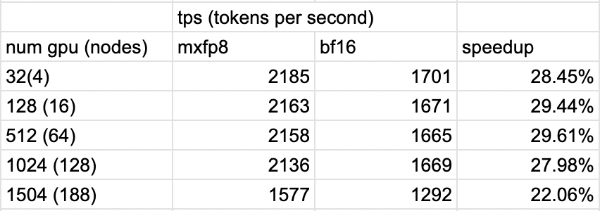 圖 3:MXFP8 在不同 GPU 規模下訓練的加速效果