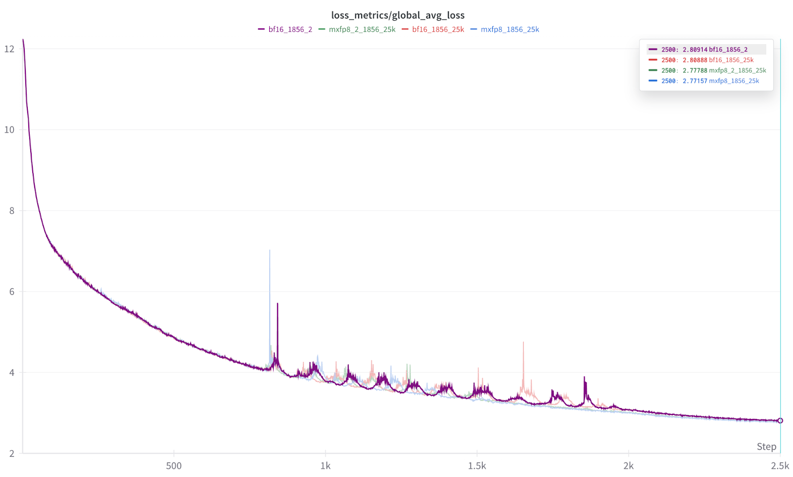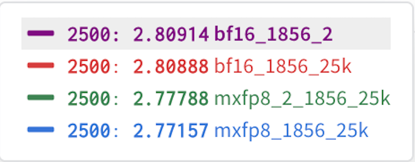 更重要的是,在 1856 規模下,我們還看到損失曲線的收斂性幾乎相同(MXFP8 略佔優勢)
