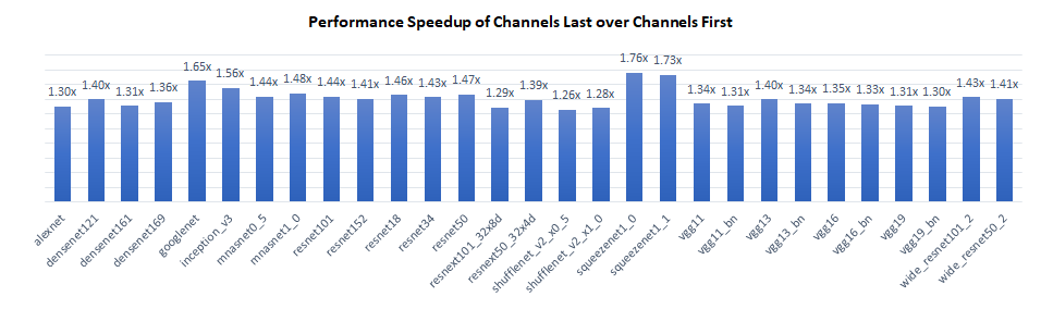 我們在Intel® Xeon® Platinum 8380 CPU @ 2.3 GHz上對TorchVision模型的推理效能進行了基準測試,每個插槽單例項(批處理大小=2 x 物理核心數)。結果顯示,“通道居後”比“通道優先”具有1.3倍到1.8倍的效能提升。