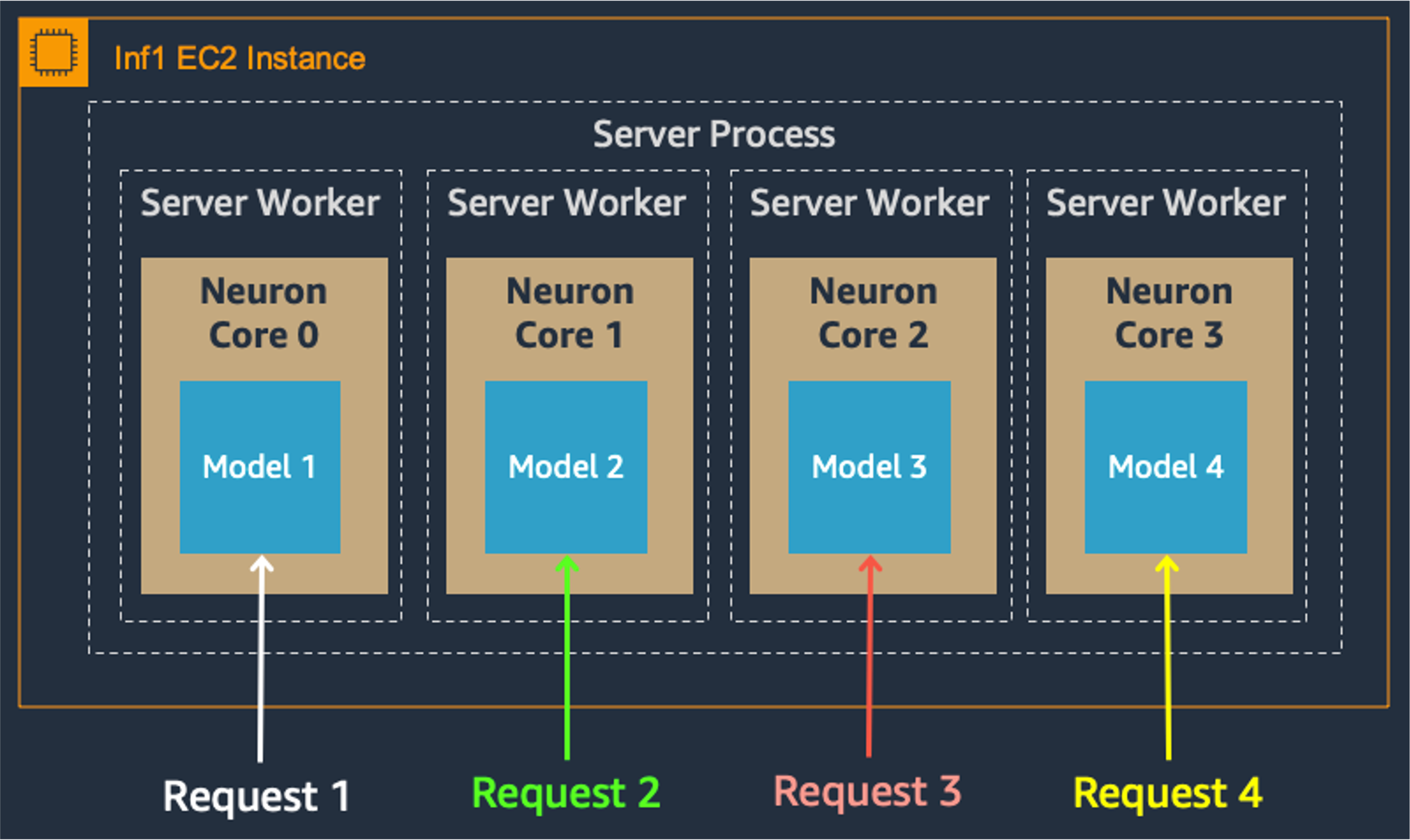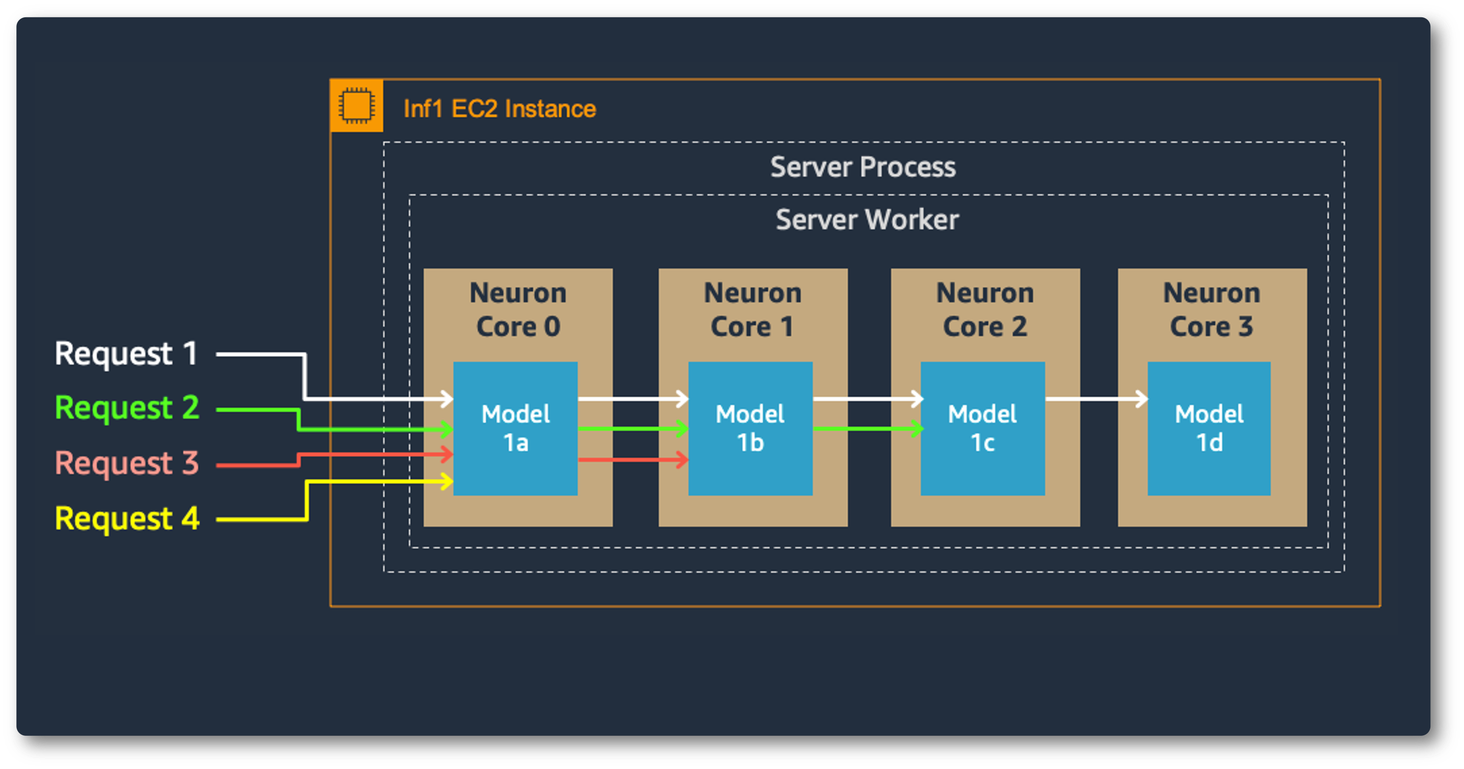 多核模型並行性也改善了吞吐量和延遲,這對於我們繁重的工作負載至關重要。每個 Inferentia 晶片包含四個 NeuronCore,它們可以同時執行單獨的模型,也可以形成管道來流式傳輸單個模型。在我們的用例中,資料並行配置以最低的成本提供最高的吞吐量,因為它擴充套件了併發處理請求。