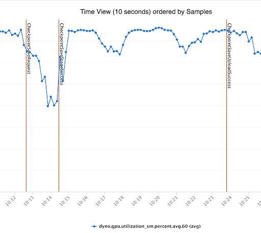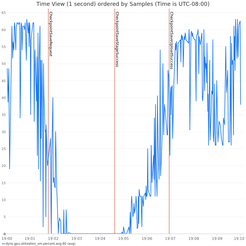 請參閱我們實驗中的下圖,它展示了基於執行緒的非同步檢查點對 GPU 利用率和訓練 QPS 的影響。