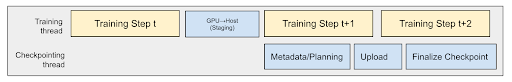 在典型的檢查點工作流程中,當檢查點資料從 GPU 傳輸到 CPU 再傳輸到儲存時,GPU 會處於空閒狀態,只有在資料儲存後訓練才會恢復。非同步檢查點透過將資料儲存過程解除安裝到 CPU 執行緒,顯著減少了 GPU 阻塞時間。只有 GPU 解除安裝步驟仍然是同步的。這允許基於 GPU 的訓練同時進行,而檢查點資料則上傳到儲存。它主要用於中間檢查點或容錯檢查點,因為它比同步方法更快地釋放 GPU。訓練立即恢復,極大地提高了同步檢查點上的訓練吞吐量。欲瞭解更多詳細資訊,請參閱這篇 文章。