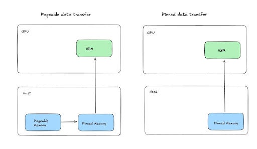 基本思想是,由於 GPU 的某些機制,資料預設透過固定(不可分頁)記憶體傳輸到可分頁記憶體,這可以透過將某些位元組地址範圍指定為固定來最佳化,從而允許直接從 GPU 複製到共享記憶體。透過這種方法,我們看到暫存時間(GPU 阻塞時間)提高了 2 倍,顯著有助於提高訓練吞吐量,並允許更積極的檢查點間隔。