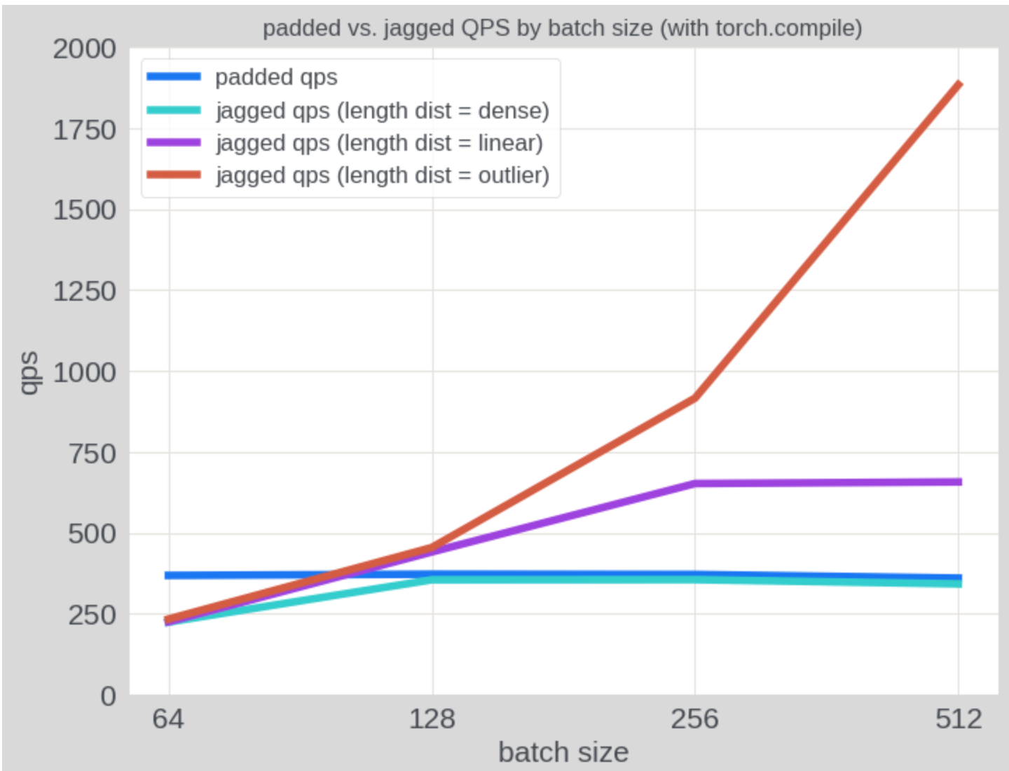 正如預期的那樣,與填充張量相比,NJT 在具有不均勻序列長度的輸入上表現出顯著更高的吞吐量。在下圖中,我們使用各種序列長度模式的合成數據評估了 QPS:(1) “密集”批次,其中每個序列的長度為 256;(2) “線性”批次,其中批次中的序列長度從 1 線性增加到 256;以及 (3) “異常值”批次,其中一個序列的長度為 256,其餘序列的長度為 1。在使用填充張量時,所有三種情況的推理成本保持不變,而使用 NJT 時,推理成本隨著批次稀疏性的增加而降低。在“線性”分佈上,NJT 的效能優於填充張量約 1.85 倍。