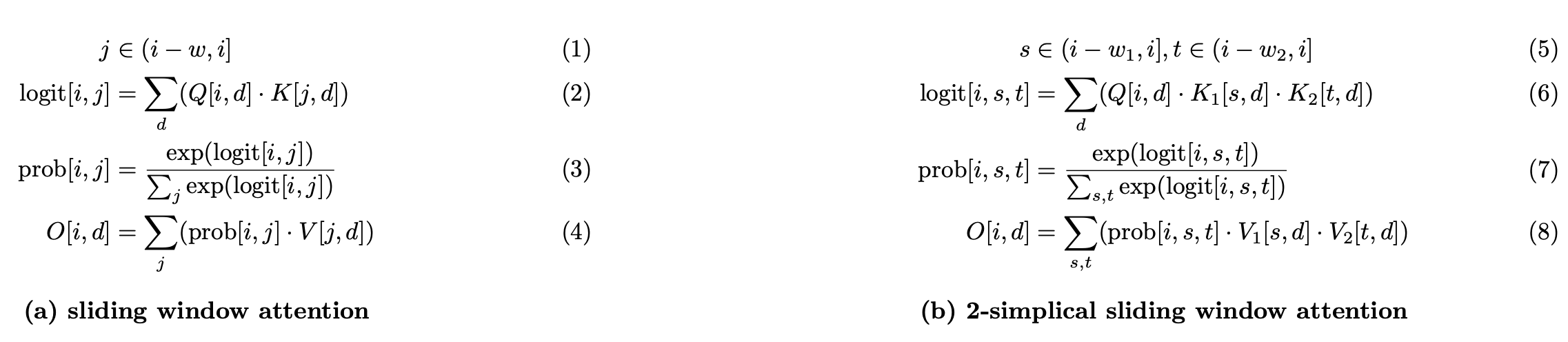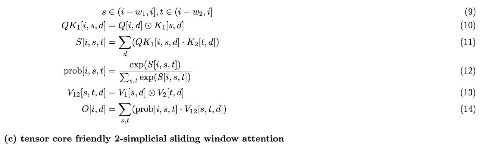 這種重新表述(如 公式 (c) 所示)將 2-單純滑動視窗注意力轉換為 Tensor Core 友好 的設計,並保持了數學等價性。