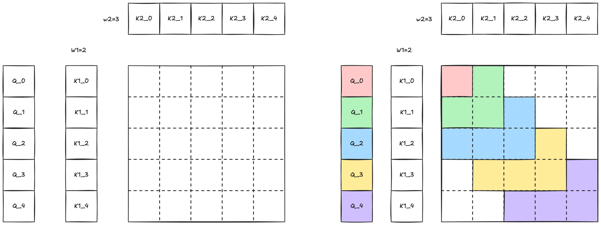 圖 3:帶有二維滑動視窗的 2-單純注意力示意圖。與 Q 詞元顏色相同的彩色區域表示查詢可以關注鍵和值的二維鄰域 (W1 × W2)。