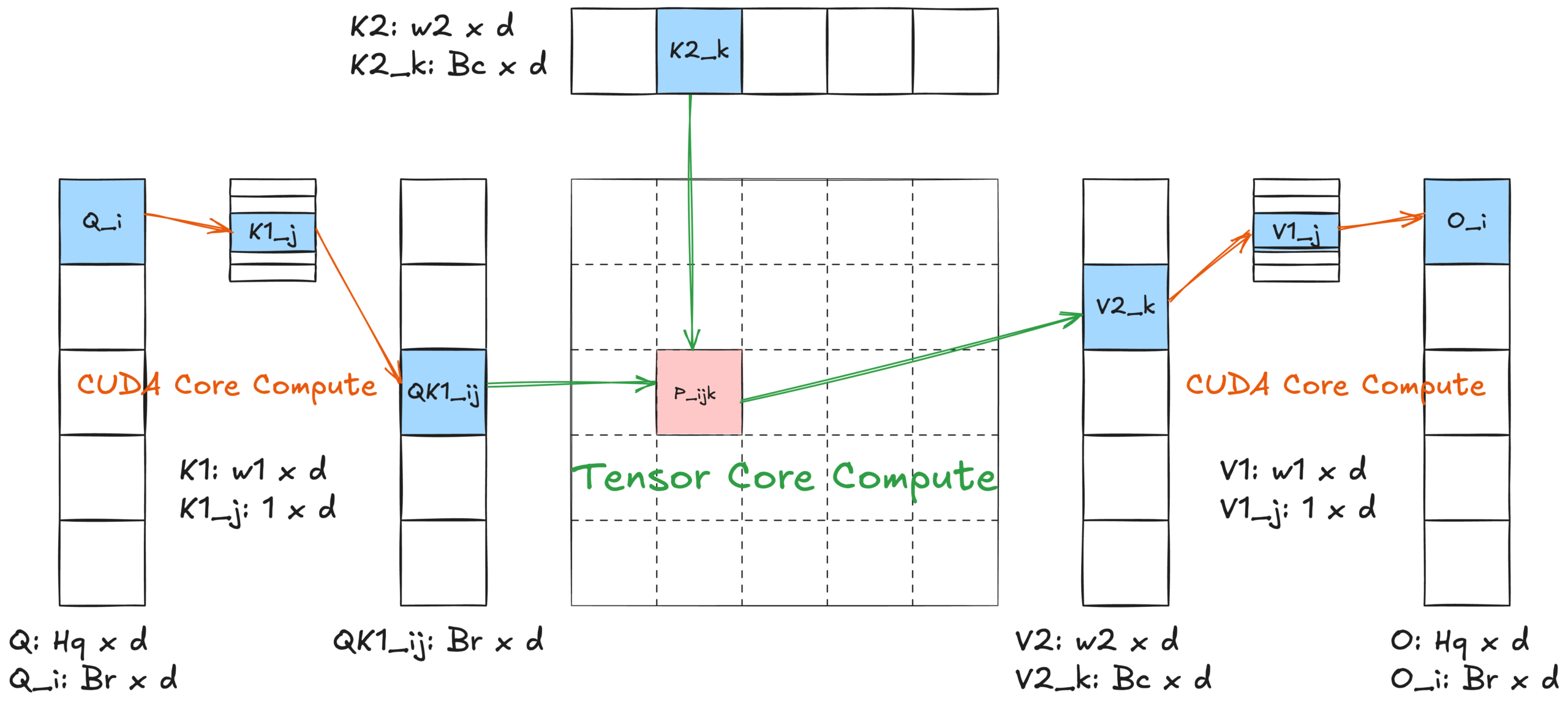 - 首先,我們預計算 Q[i] 和 K1[s] 的元素乘積(公式 (c) 第 10 行),從而實現後續與 K2[t] 的乘法(公式 (c) 第 11 行)的 Tensor Core 計算。