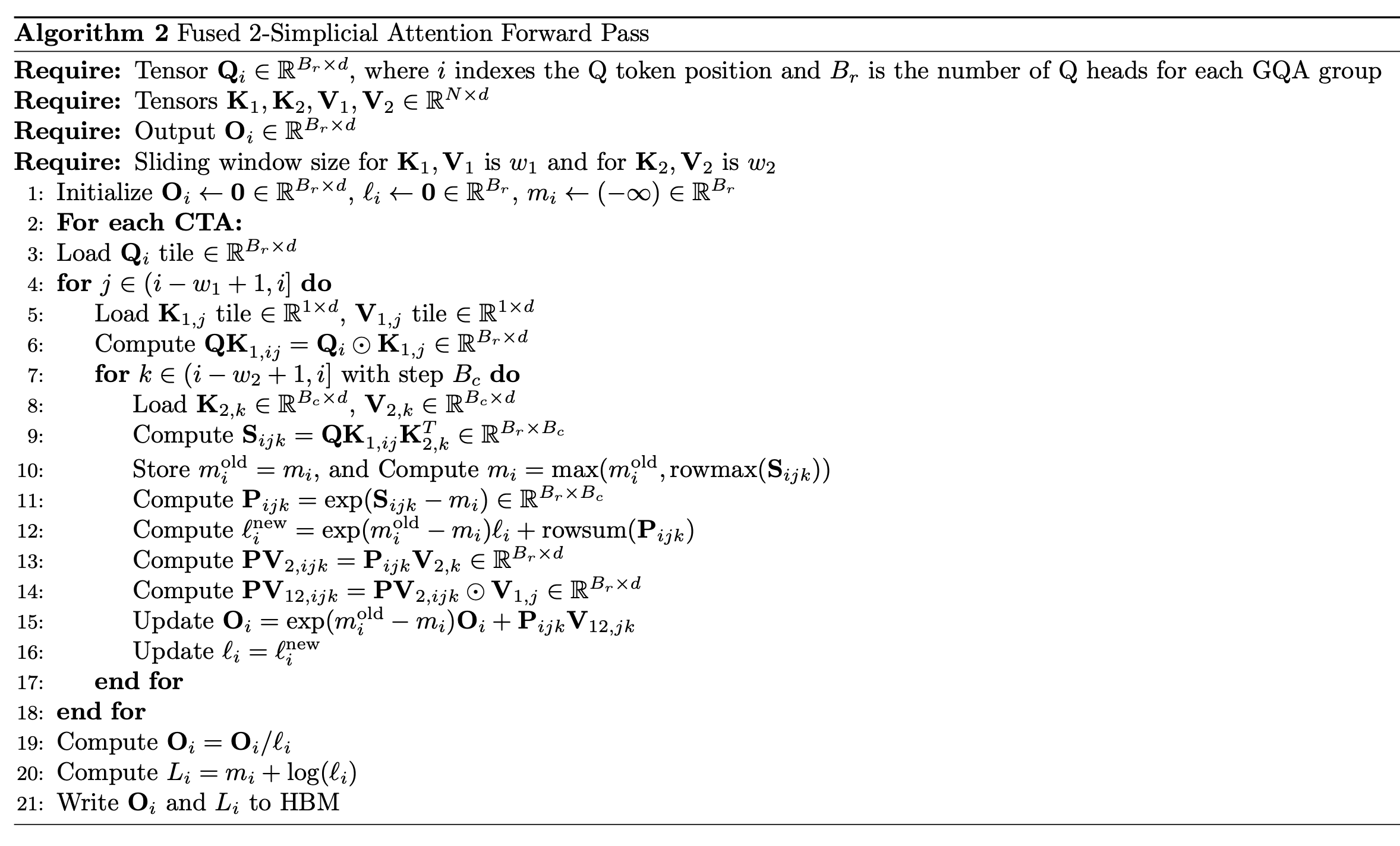 基於所有這些特性和 FlashAttention2 [3] 演算法,我們實施了融合的 2-單純注意力核心演算法——演算法 2。與點積注意力相比,它引入了兩個巢狀的 w1 和 w2 內迴圈,其中最內層迴圈與 FlashAttention2 的內迴圈非常相似。