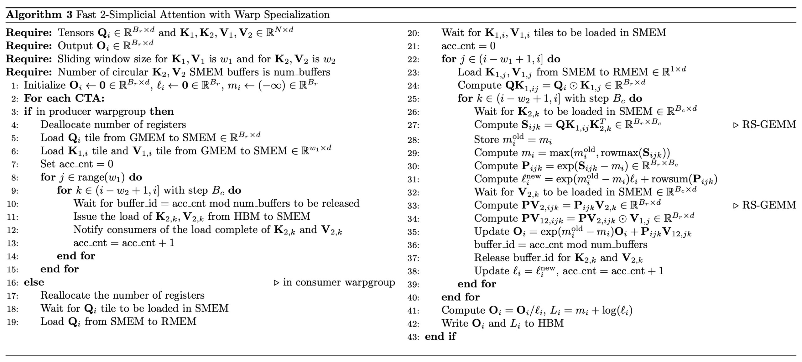 - 在共享記憶體 (SMEM) 中保留所有 K1 和 V1 瓦片:根據演算法 2,每個 K1/V1 瓦片形狀為 [1, D],需要 W1 次載入。對於較小的 W1,我們可以在迴圈外將所有 W1 個 K1/V1 瓦片以 [W1, D] 的形狀載入到 SMEM 中,然後在 W1 迴圈期間將單個 [1, D] 瓦片從 SMEM 重新載入到暫存器中。對於 W1 = 32,D = 128,以及 BFloat16 精度,K1 和 V1 瓦片的總大小為 16KB,約佔 H100 SMEM 容量的 7%。