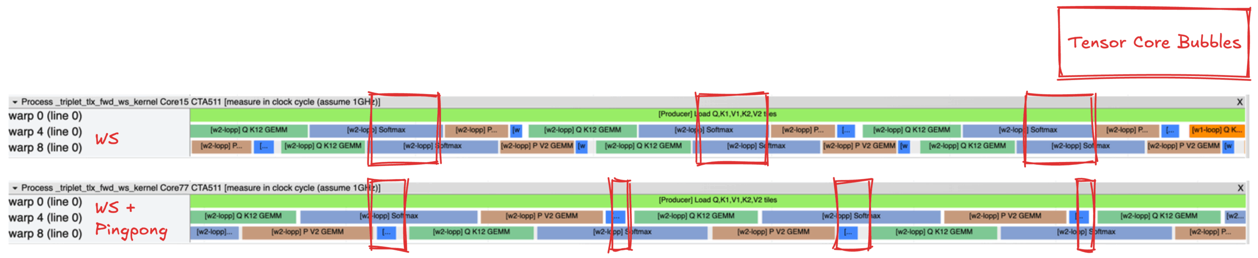 圖 6:核心 1 WS(頂部)和核心 3 WS + 乒乓(底部)的 Tensor Core 氣泡示意圖