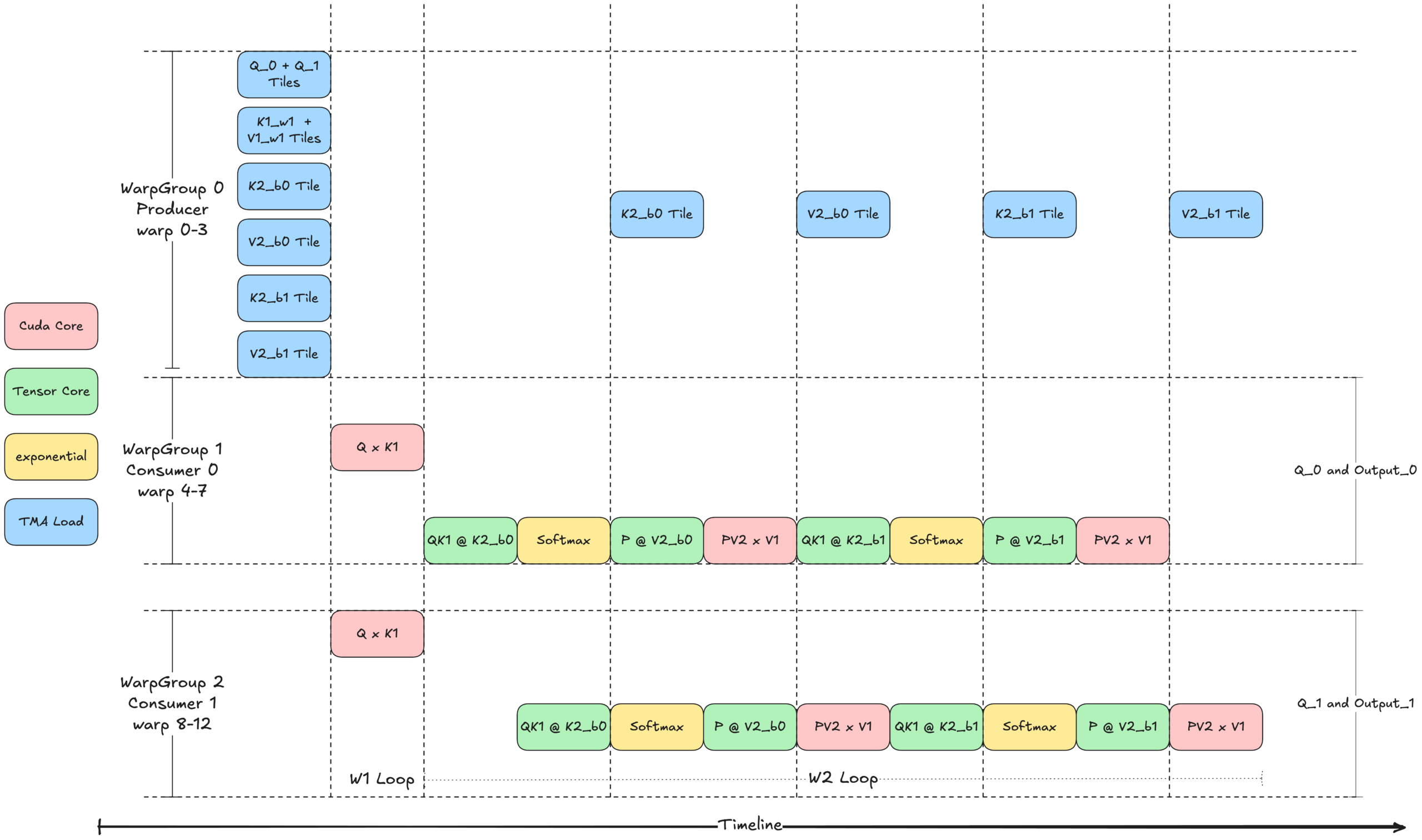 每個消費者組在不同的 Q 瓦片上操作,但共享相同的 K1、V1、K2 和 V2 瓦片,同時為不同的輸出瓦片生成結果。為了最大限度地提高效率,乒乓排程確保在任何時候只有一個 warp 組執行 Tensor Core (WGMMA) 操作。