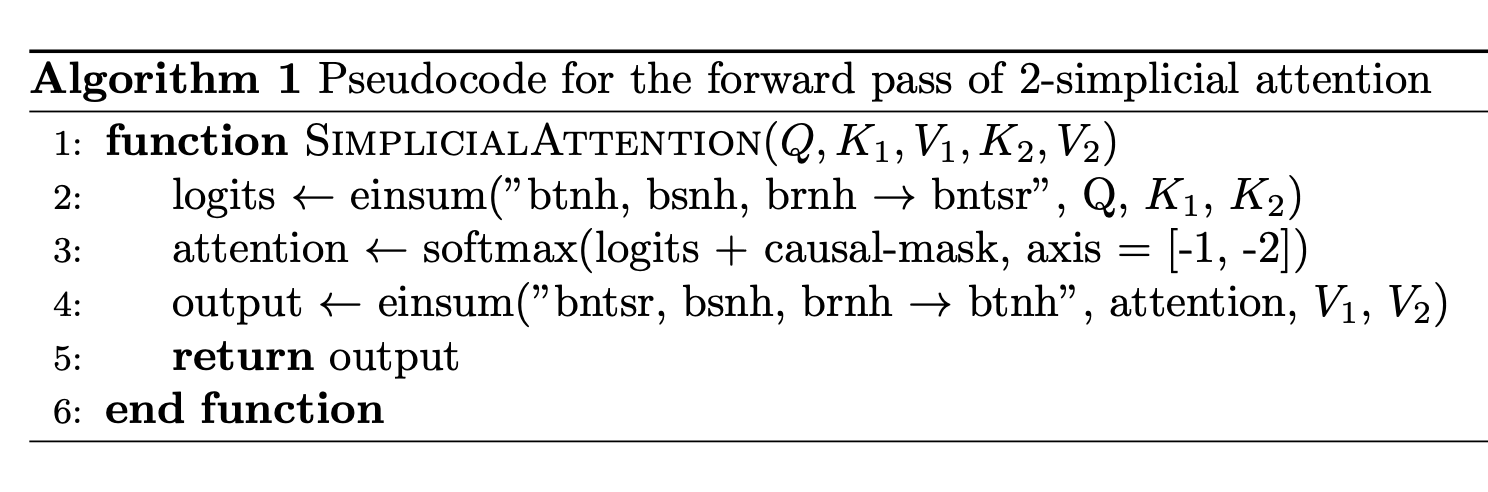 隨著大型語言模型的不斷擴充套件,獲取足夠高質量的訓練詞元變得越來越具有挑戰性。提高注意力機制的詞元效率對於解決這個問題至關重要。一個很有前途的進展是 2-單純注意力(演算法 1),它使用三線性函式來建模查詢與兩組鍵(K1、K2)和兩組值(V1、V2)之間的互動,以建模詞元三元組之間複雜的互動,而不是像標準點積注意力那樣只建模詞元對。正如論文《邏輯與 2-單純 Transformer》[3] 中首次提出的那樣,2-單純注意力在基本保持原始模型大小的同時增加了注意力的 TFLOPs。根據縮放律實驗,2-單純注意力在詞元效率方面顯示出顯著改進,特別是在數學和邏輯問題解決等推理任務中。