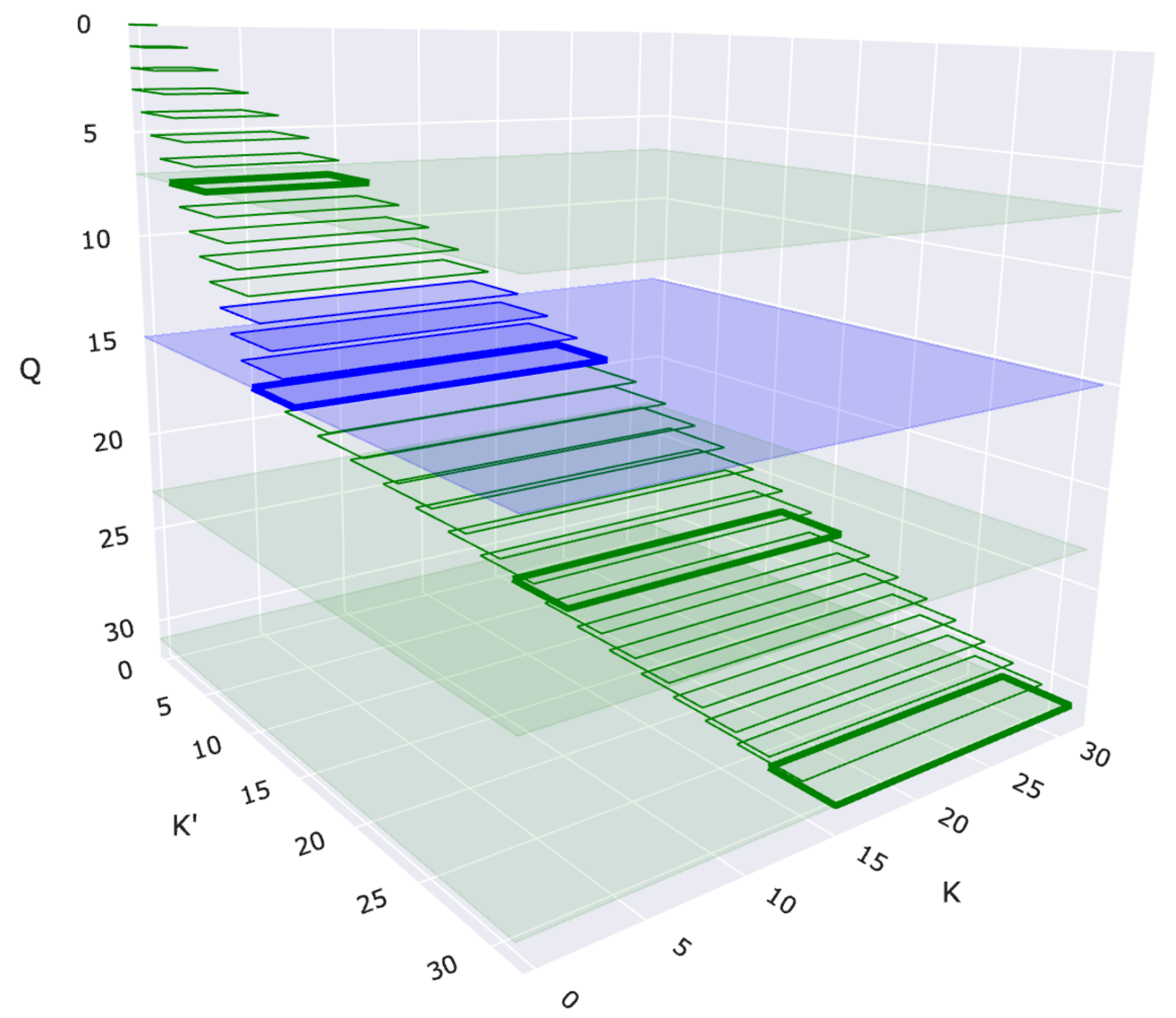 圖 1:帶有二維滑動視窗的 2-單純注意力視覺化。每個矩形表示一個查詢 (Q) 和一對鍵 (K' 和 K) 之間的互動。藍色矩形突出顯示滑動視窗結構中特定的查詢-鍵對互動。