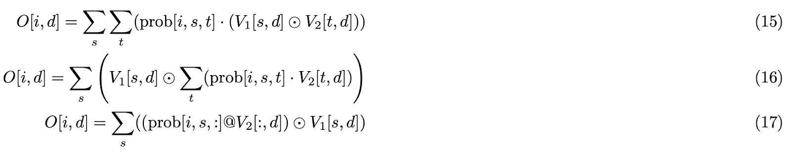 def dot_product(A, B): """ Standard dot product (matrix multiplication) Input: A in [M, K], B in [N, K] Output: C in [M, N] This is equivalent to A @ B.T """ M, K = A.shape N, K2 = B.shape assert K == K2, "Inner dimensions must match" C = np.zeros((M, N)) for i in range(M): for j in range(N): C[i][j] = sum(A[i][inner_k] * B[j][inner_k] for inner_k in range(K)) return C def trilinear_product_2D_to_3D(A, B1, B2): """ Trilinear product for computing 3D attention logits Input: A in [M, K], B1 in [N, K], B2 in [N, K] Output: C in [M, N, N] Each element C[i,j,k] is the sum of element-wise products of A[i,:], B1[j,:], and B2[k,:] along the K dimension """ M, K = A.shape N, K1 = B1.shape N2, K2 = B2.shape assert K == K1 == K2, "All K dimensions must match" assert N == N2, "N dimensions must match" C = np.zeros((M, N, N)) for i in range(M): for j in range(N): for k in range(N): C[i][j][k] = sum(A[i][inner_k] * B1[j][inner_k] * B2[k][inner_k] for inner_k in range(K)) return C def trilinear_product_3D_to_2D(A, B1, B2): """ Trilinear product for aggregating with 3D attention weights Input: A in [M, N, N], B1 in [N, K], B2 in [N, K] Output: C in [M, K] Uses 3D attention weights A to aggregate information from B1 and B2 """ M, N, N2 = A.shape assert N == N2, "A must be square in last two dimensions" N3, K = B1.shape N4, K2 = B2.shape assert N == N3 == N4, "N dimensions must match" assert K == K2, "K dimensions must match" C = np.zeros((M, K)) for i in range(M): for k in range(K): C[i][k] = sum(A[i][a][b] * B1[a][k] * B2[b][k] for a in range(N) for b in range(N)) return C