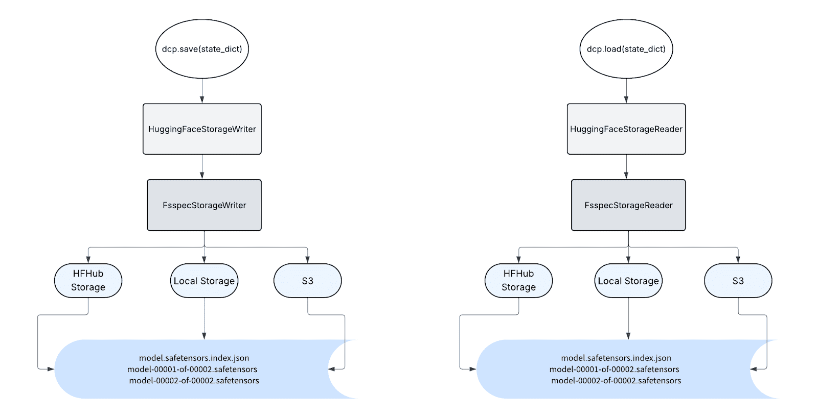 PyTorch 分散式檢查點 (DCP) 正在投入解決互操作性障礙,以確保像 HuggingFace safetensors 這樣的流行格式能夠與 PyTorch 生態系統良好協作。由於 HuggingFace 已成為推理和微調領域的主導格式,DCP 開始支援 HuggingFace safetensors。這些更改的第一個客戶是 torchtune,他們看到了改進的使用者體驗,因為他們現在可以直接使用 DCP API 清晰地讀寫 HuggingFace。