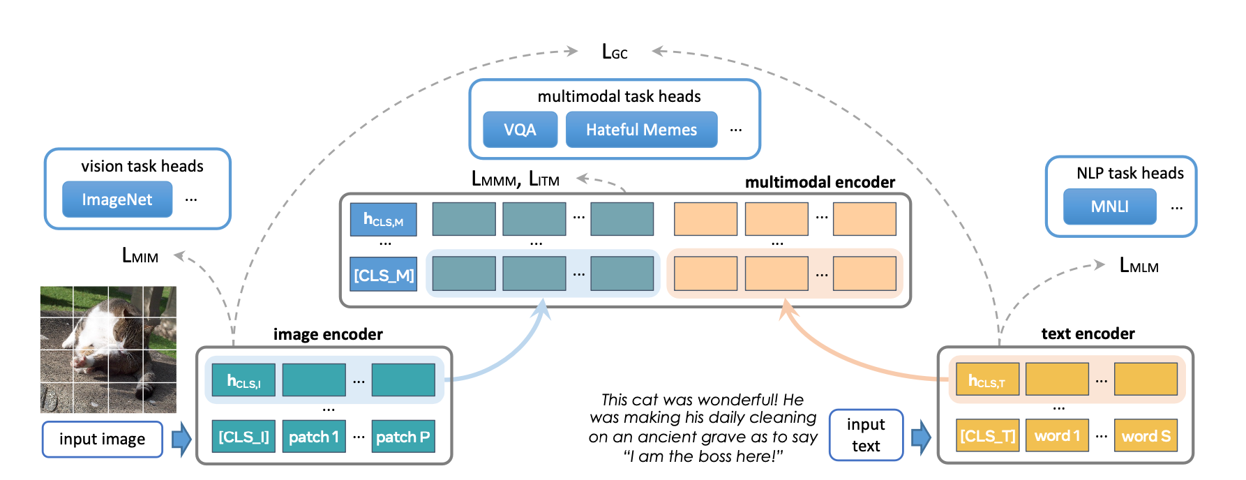 FLAVA 是一種基礎多模態模型,由基於 Transformer 的影像和文字編碼器組成,然後是一個基於 Transformer 的多模態融合模組。它使用各種損失在單模態和多模態資料上進行預訓練。這包括掩碼語言、影像和多模態建模損失,這些損失要求模型從其上下文(自監督學習)重建原始輸入。它還使用影像文字匹配損失對對齊影像-文字對的正例和負例以及 CLIP 風格的對比損失進行訓練。除了多模態任務(如影像-文字檢索)之外,FLAVA 在單模態基準(NLP 的 GLUE 任務和視覺的影像分類)上也表現出有競爭力的效能。