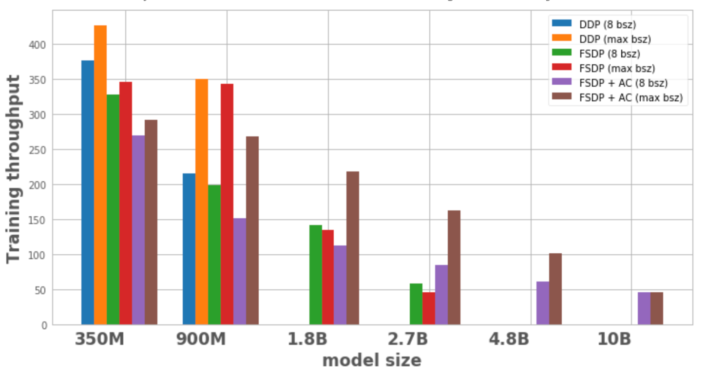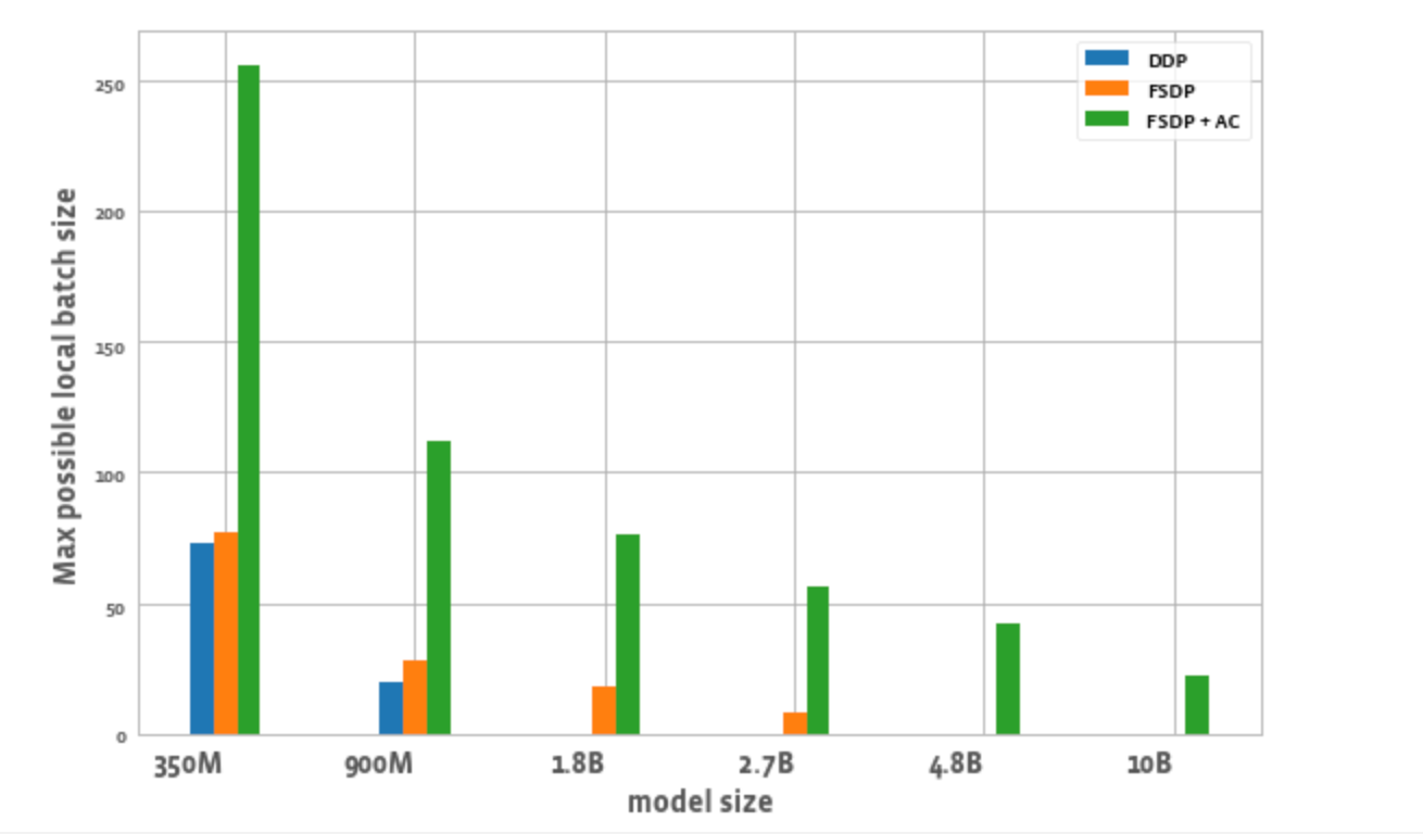 - 模型大小擴充套件:DDP 只能在一個節點上容納 3.5 億和 9 億引數的模型。透過 FSDP,由於節省了記憶體,我們能夠訓練比 DDP 大約 3 倍的模型(即 18 億和 27 億引數的變體)。將啟用檢查點 (AC) 與 FSDP 結合使用,可以訓練更大的模型,比 DDP 大約 10 倍(即 48 億和 100 億引數的變體)。