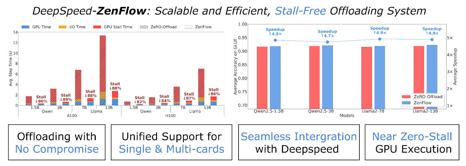 ZenFlow 透過無停滯訓練流水線解決了這一瓶頸。它優先處理高影響力的梯度以進行即時GPU更新,同時將其餘梯度解除安裝到CPU並非同步應用它們。這些延遲的CPU更新與GPU計算完全重疊,消除了停滯並顯著提高了吞吐量。最重要的是,ZenFlow保持了相同的模型精度,並與DeepSpeed無縫整合。