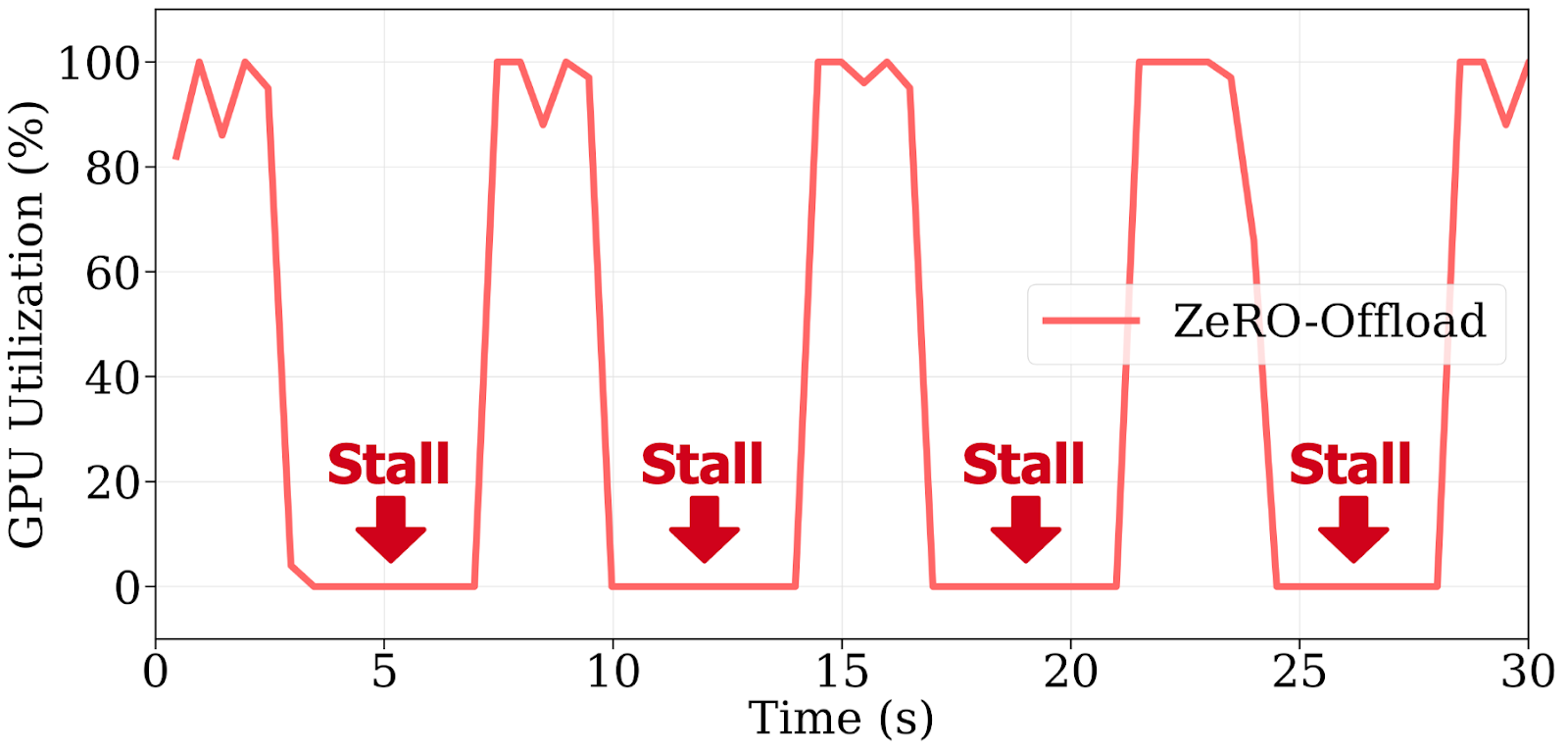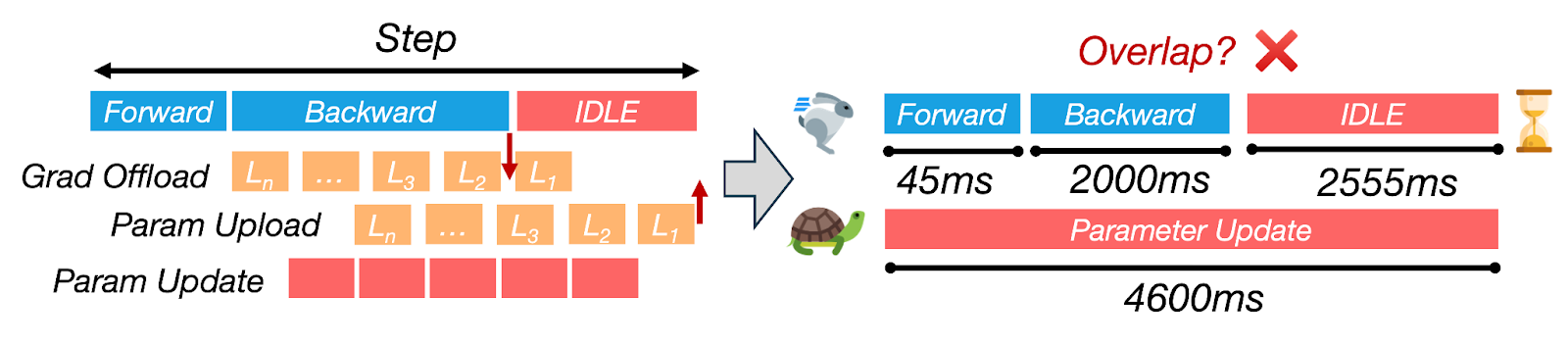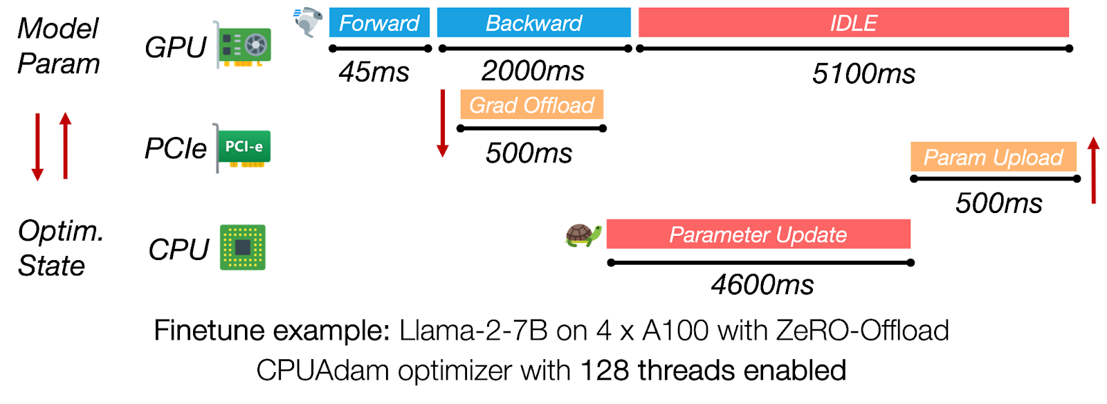 同步解除安裝框架(例如,ZeRO-Offload)在CPU執行完整最佳化器步驟並將更新的引數傳輸回GPU時,使GPU處於空閒狀態。對於Llama-2-7B在4塊A100上的訓練,CPU路徑可能需要超過4秒,而反向傳播則需要大約2秒,因此每次迭代超過60%的時間是純粹的GPU等待時間。消除這種序列化對於實現高GPU利用率至關重要。