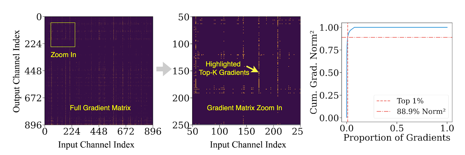 並非所有梯度都同等重要。我們的分析表明,在微調過程中,前1%的梯度通道貢獻了超過90%的L²範數能量。換句話說,大多數更新對模型學習的影響很小,但在傳統解除安裝流水線中仍會產生不成比例的高計算和I/O成本。