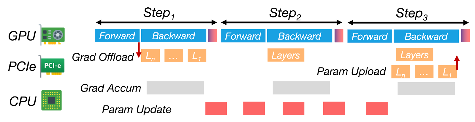 - 梯度傳輸到CPU: 當GPU忙碌時,來自當前迭代(或先前迭代)的梯度透過專用PCIe流傳輸到CPU。這與GPU計算並行進行,不會導致任何GPU等待時間。