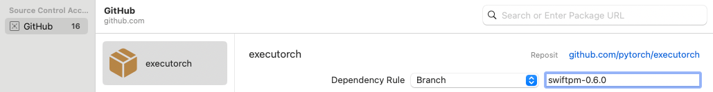 在 Xcode 中,前往 檔案 > 新增包依賴項。將 ExecuTorch 倉庫的 URL 貼上到搜尋欄中並選擇它。確保將分支名稱更改為所需 ExecuTorch 版本,格式為“swiftpm-