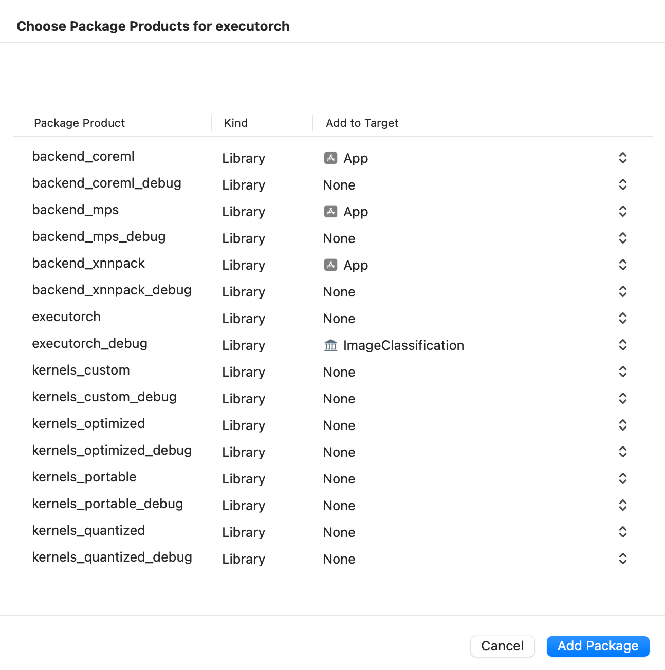 然後選擇哪個 ExecuTorch 框架應連結到哪個目標。