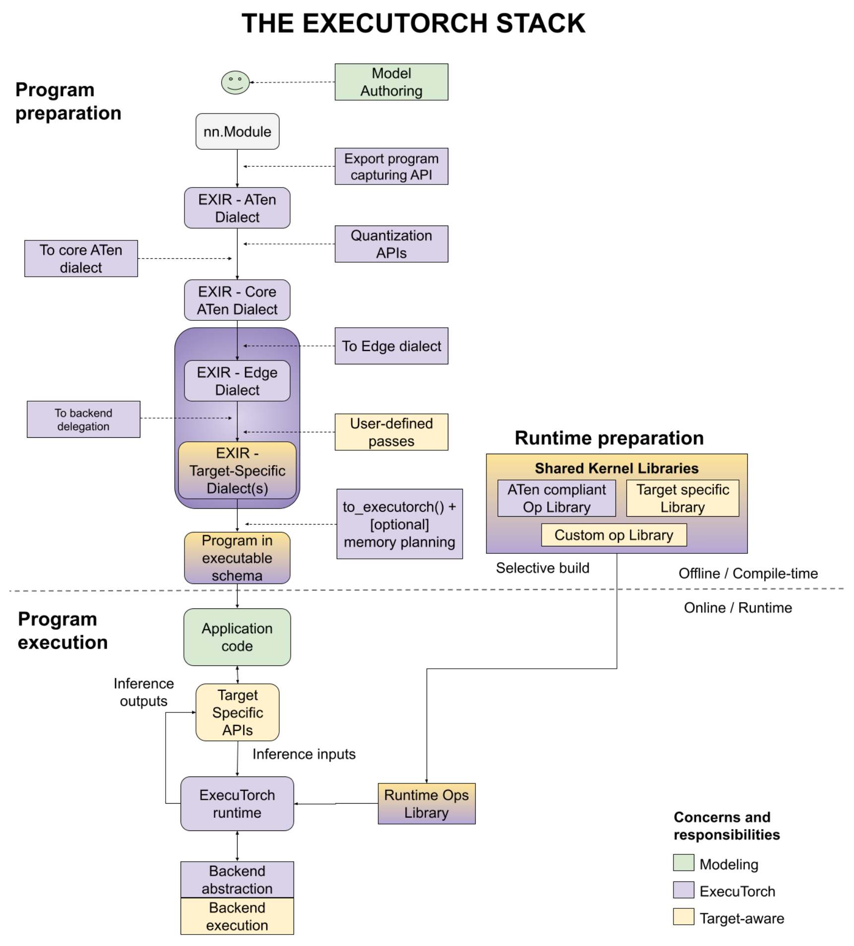 將 PyTorch 模型部署到裝置端分為三個階段:程式準備、執行時準備和程式執行,如下圖所示,並帶有多個使用者入口點。我們將在本文件中分別討論每個步驟。