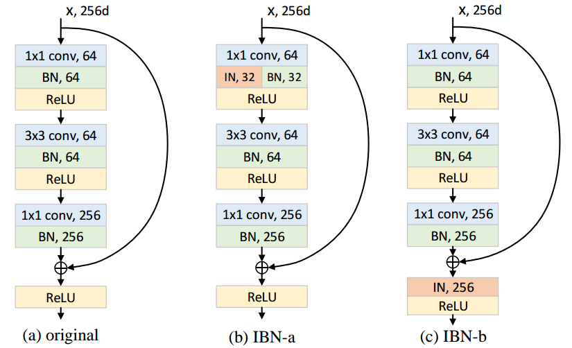 IBN-Net是一種具有域/外觀不變性的CNN模型。受風格遷移工作的啟發,IBN-Net在一個深度網路中巧妙地統一了例項歸一化和批歸一化。它提供了一種簡單的方法,在不增加模型複雜性的情況下,同時提高建模和泛化能力。IBN-Net特別適用於跨域或人物/車輛再識別任務。